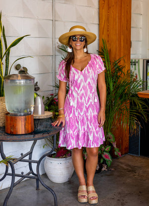 New style! The best-selling Emily dress with an all-new short sleeve! The perfect throw-on spring dress! The short sleeve Emily dress features a drop-waist that compliments all body types, and a front tie with tassel accents. -Fabric- 100% rayon Care - Dry Clean, machine wash cold on delicate cycle, or hand wash. Lay flat or hang to dry. Steam or iron to remove wrinkles as needed.