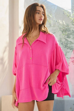 T2195B Oversized Drawstring Tie Sleeves Solid Top: Fuchsia