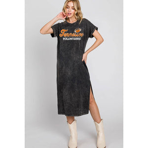 100% Cotton graphic knee length dress with an authentic vintage look and a softer feel that is only possible to achieve due to our special enzymes used to dye and mineral wash processes. Maxi t shirt dress with tacked sleeves & side slits - Washing Instructions: - Cold water preferably like colors - Do not bleach, hang or line dry - Tumble dry low - Model is wearing a size Small Graphic tee & top garment dye.