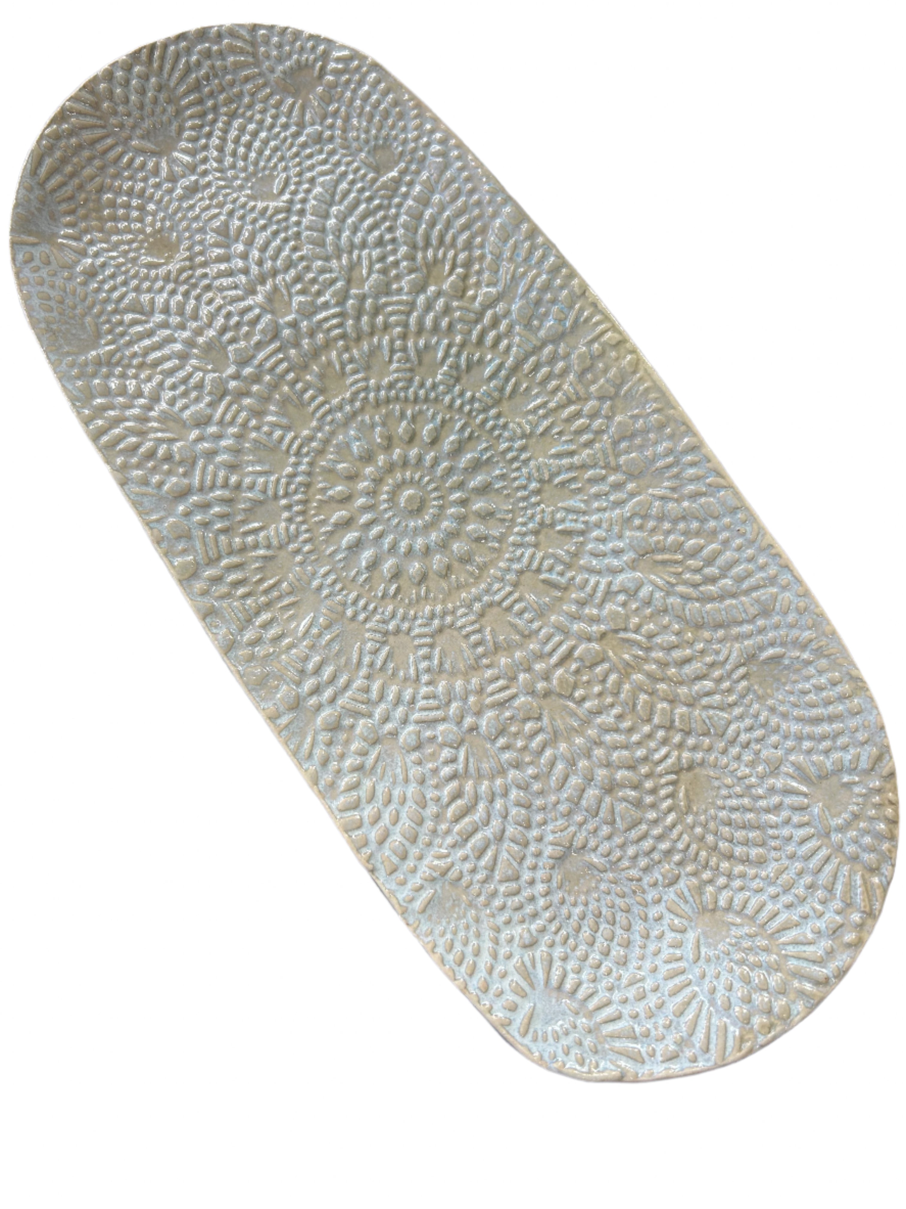Enjoy your very own piece of Memphis, TN pottery created by our local Memphis Potter, Boo Gardo - made right here in Downtown Memphis. This serving dish is a nice oval shape in a baby powder-blue with tan base and a Mosaic Inlay. The side of this platter has a crimped border and pairs well with other pieces in the Mosaic collection.