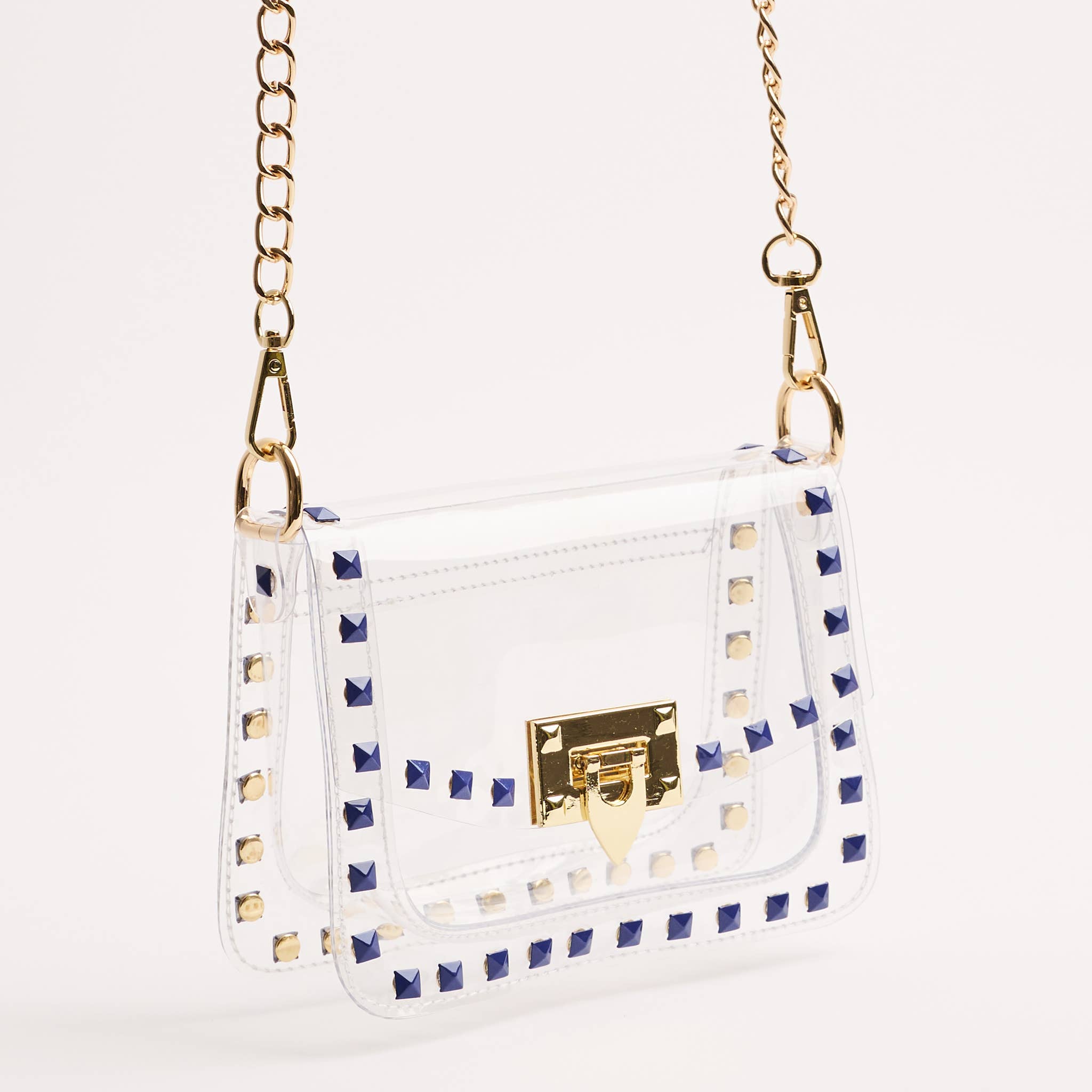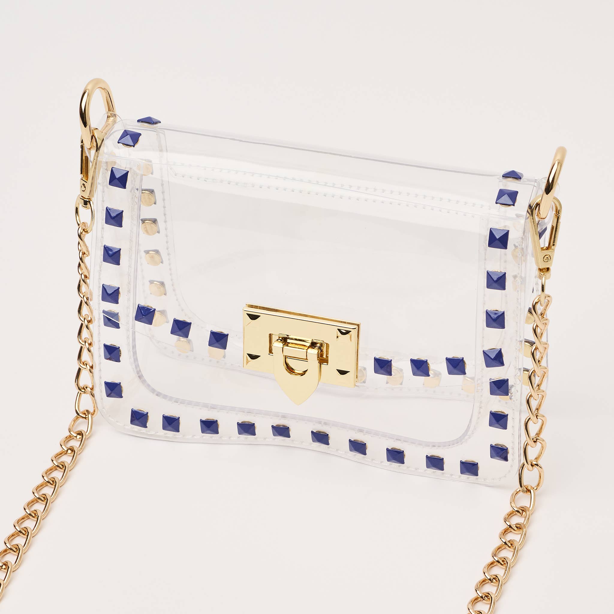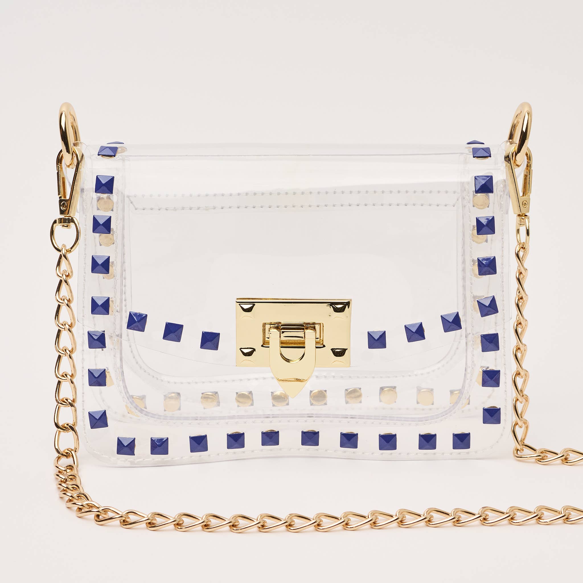 Score with the biggest winner in our clear handbag playbook - The Jackie! The Jackie changed the handbag game by proving clear handbags could be both functional and chic. This style includes royal blue square metal studs and a gold chain. The Jackie is NCAA and NFL-compliant and the ideal size to hold your wallet, phone, keys, lip gloss, and a few other small items. DETAILS: • W 8" x H 6" x D 3" • Durable PVC • Blue Square Stud Accent • Gold-Plated Hardware and Chain