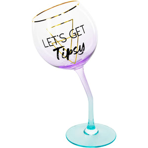 11oz uniquely-shaped novelty stemmed wine glass, packaged in a printed box, is made from glass. "Let's Get Tipsy" text and accompanying geometric design are printed onto the front of the glass alongside a spray-painted double ombre design. To best preserve decals, wash by hand only using mild detergent. Do not leave soaking in water. Only fill glass halfway to avoid spillage. Great for gifting to a friend.