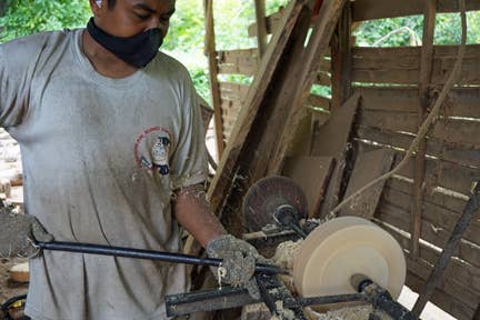 Traditional frame drum from Java, Indonesia. The tight head will deliver years of great play. Goat skin and Mango wood frame. ~ 6"+ head x 3" frame, includes stick.
