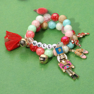 Size : 2.25" H Stretchable Celebrate the season with this charming “HOLLY” beaded bracelet set featuring colorful beads, festive Nutcracker and candy cane charms, and a cheerful bow accent. The stretch fit offers comfort and playful elegance, perfect for parties, gifting, or spreading Christmas joy. Lead and Nickel Compliant