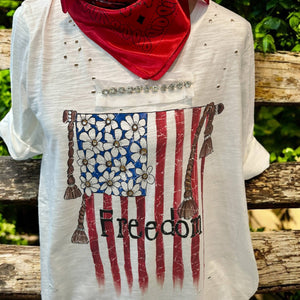 Great design for all year round for those Americana's with the Heart for the flag. 3/4 sleeve that can be easily rolled up to make short sleeve. This v neck flair shirt is 100% cotton and a RARE BIRD favorite. Get it while you can!