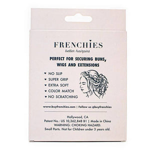 We have solved the problem of hairpins not staying in place, sliding out, scratching, damaging and irritating the skin. Unlike other hairpins, Frenchies are made to match all different hair colors.