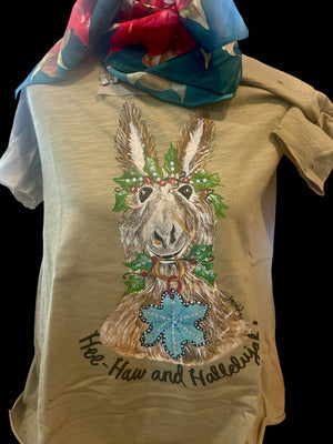 A Rare Bird original, this tattered cotton shirt features a charming hand painted donkey holding a sparkling ornament. Pretty Holly leaves and berries peek out His ears and mouth. The light olive shirt sets off the festive artwork., with HEE-HAW and HALLELUJAH scripted beneath for a joyful western touch. Finished with rhinestones at the neckline, this oversized style is available in S/M and L/XL.