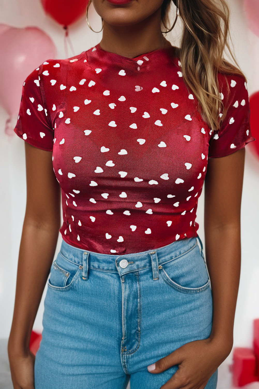 2026 Valentine Heart Print Mock Neck Mesh Short Sleeve Top Material 95%Polyester+5%Elastane Style Casual Pattern Heart Occasion Daily Season S/S ✨ Elevate outfits with this sheer mesh turtleneck. 💖 Allover heart print adds sweet charm. 🌿 Lettuce trim gives a delicate finish. 👖 Pairs perfectly with high-waist jeans. We offer personalized woven labels and tags. If you're interested in this service, please contact us to learn more details.