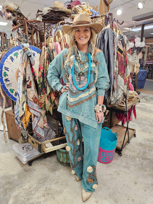 These pretty pants are made to tie back with the LOVE RIBBON SHIRT. These one size pants have lovely ribbon roses on the legs and have a draw string in their elastic waistband. So comfy and lightweight. Perfect with this top or will tie back with any fun shirt you may have.