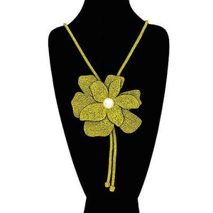 Pearl Centered Bling Studded Flower Pointed Bolo Tie Necklace • Size : 44" L • Pendant Size : 6.25" X 5" • Lead and Nickel Compliant