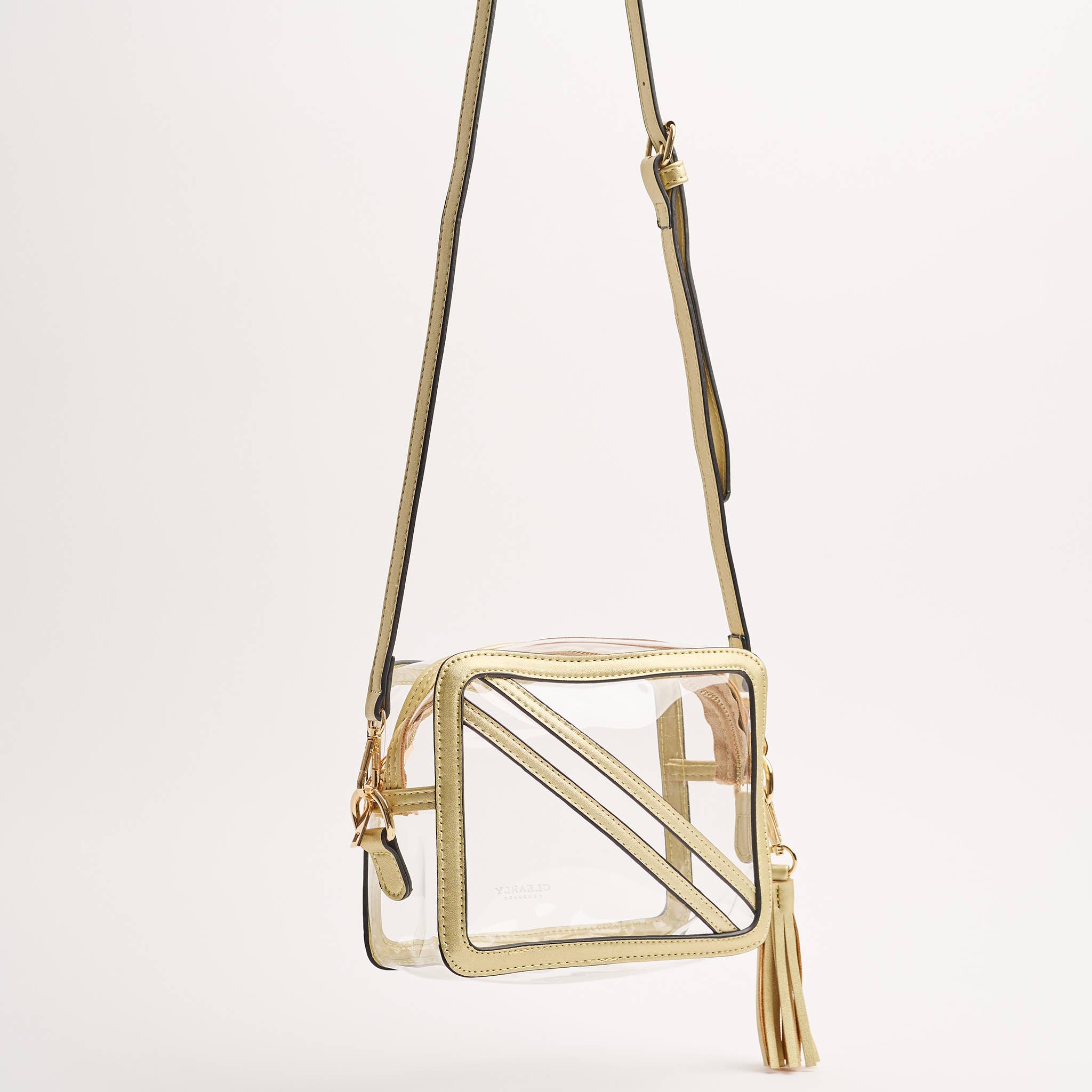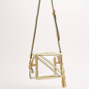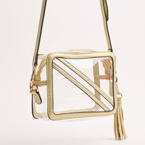 Don't worry, you are in the CLEAR for your event with The Cline by Clearly! The Cline is fashionable, sporty and the perfect size to hold your phone, wallet, keys and favorite lip gloss. Our handbags are created and designed with event requirements in mind and The Cline complies with NCAA, NFL and other event/stadium entrance requirements. DETAILS: • W 8" x H 6.5" x D 3" • Durable PVC • Gold-Plated Hardware • Metallic Gold Stripes with Tassel Accent Gold not your thing? Don't worry, we offer this style in a different color. Check out The Cline in Gunmetal!