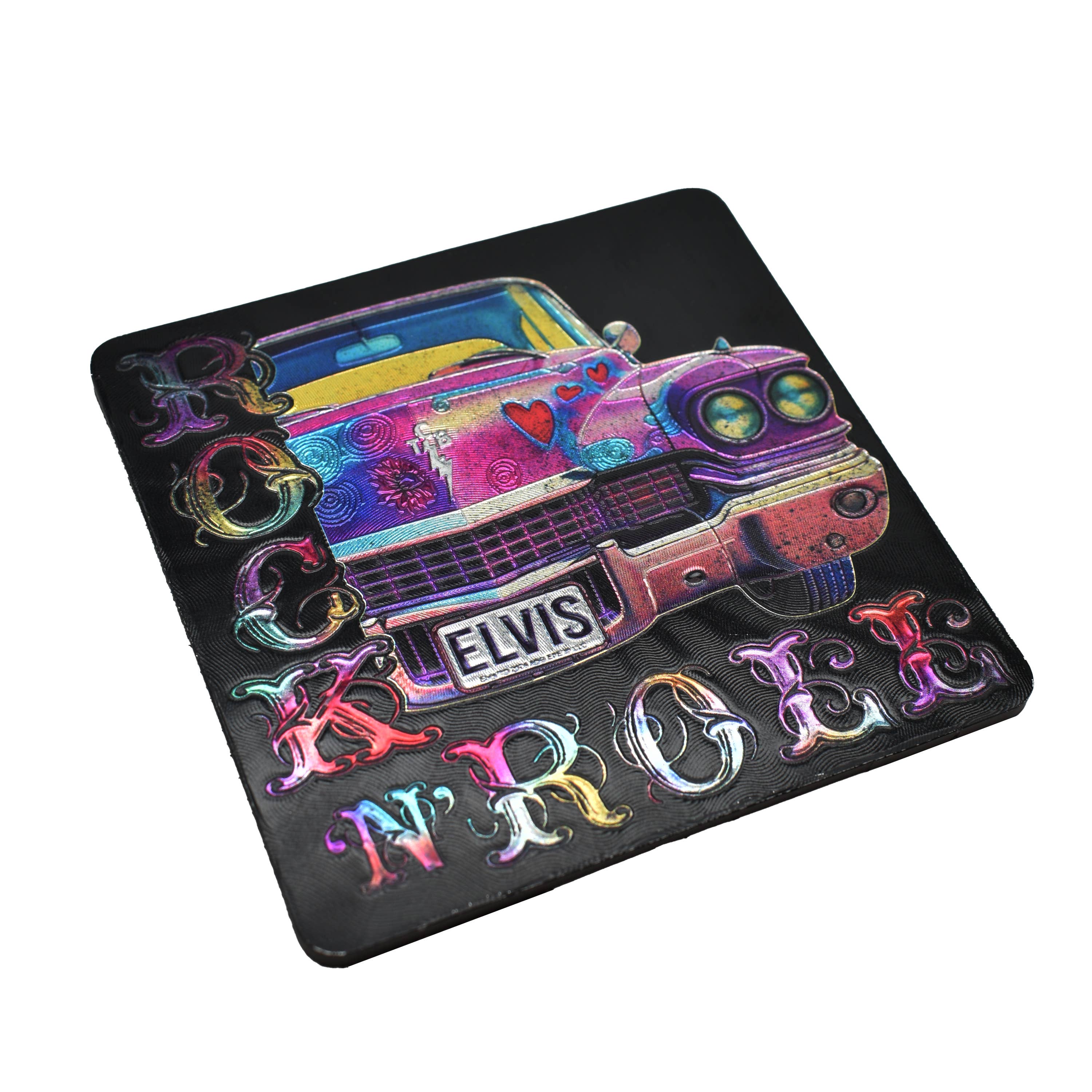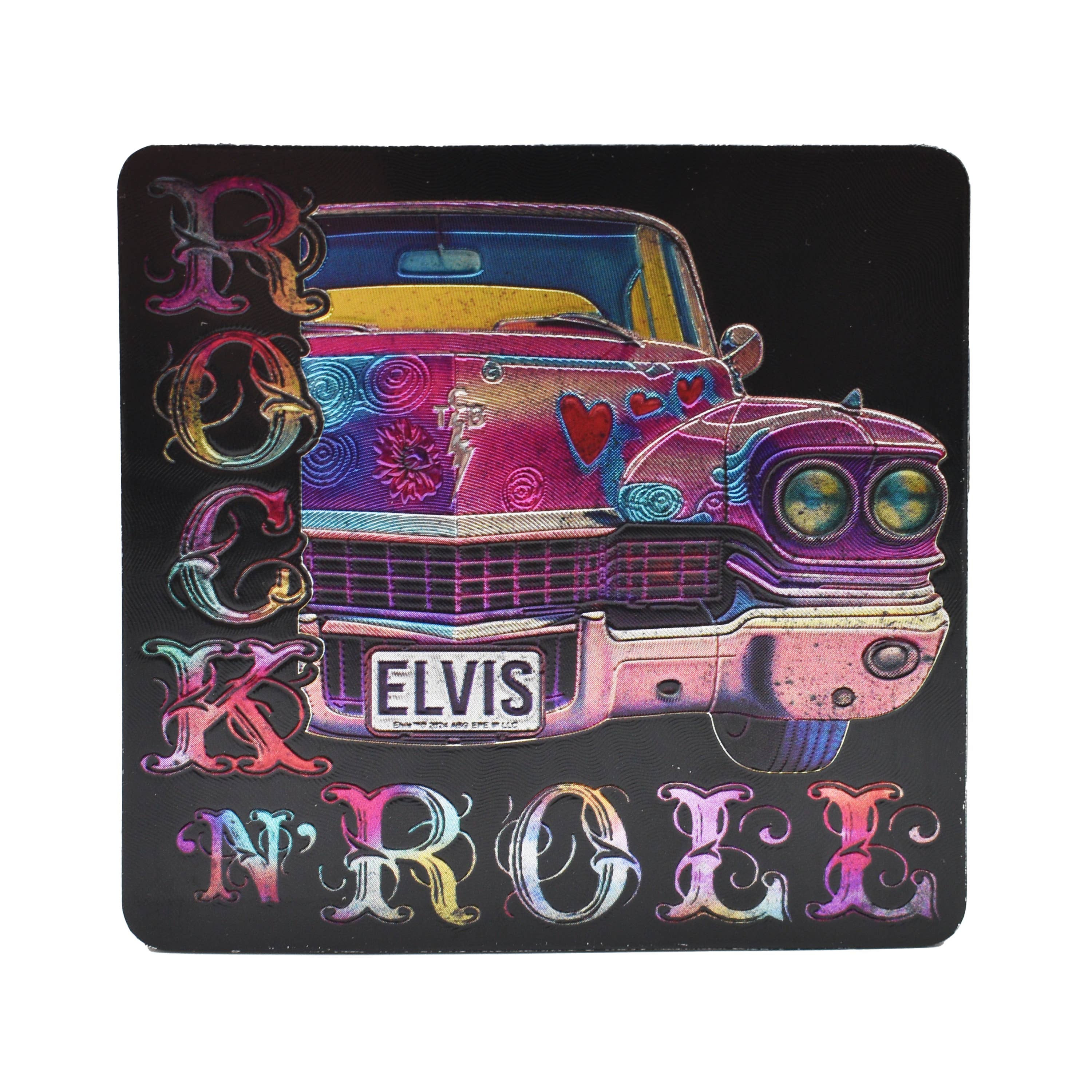 Bring the spirit of the King to your fridge with this vibrant Elvis "Rock 'N' Roll" magnet! Featuring a colorful, retro-style pink Cadillac with hearts and swirls, plus a license plate that reads "ELVIS," this bold design pops against a sleek black background. The rainbow-gradient "ROCK 'N' ROLL" lettering adds the perfect finishing touch for any Elvis or rock ‘n’ roll fan.