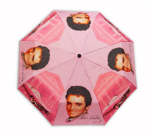 Elvis Presley umbrella designed with a pink car, Graceland, Elvis face and his signature.