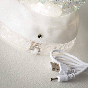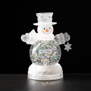 The perfect pick-me-up for any holiday home, this exclusive clear shimmer globe features a whimsical rotating snowman. This globe illuminates with light from 3 AA batteries (not included), casting festive flickering shadows as the snowman spins. An ideal accent for a mantel or tabletop, bring holiday cheer to any room in your home with this simple yet magical lighting piece, perfect for getting you into the spirit of the season. -Dimensions: 8"L x5.25"W x10" -Weight: 3.0lbs 10.00oz -Color: White -Material: Plastic -Battery: 3 AA (not included)