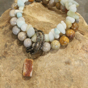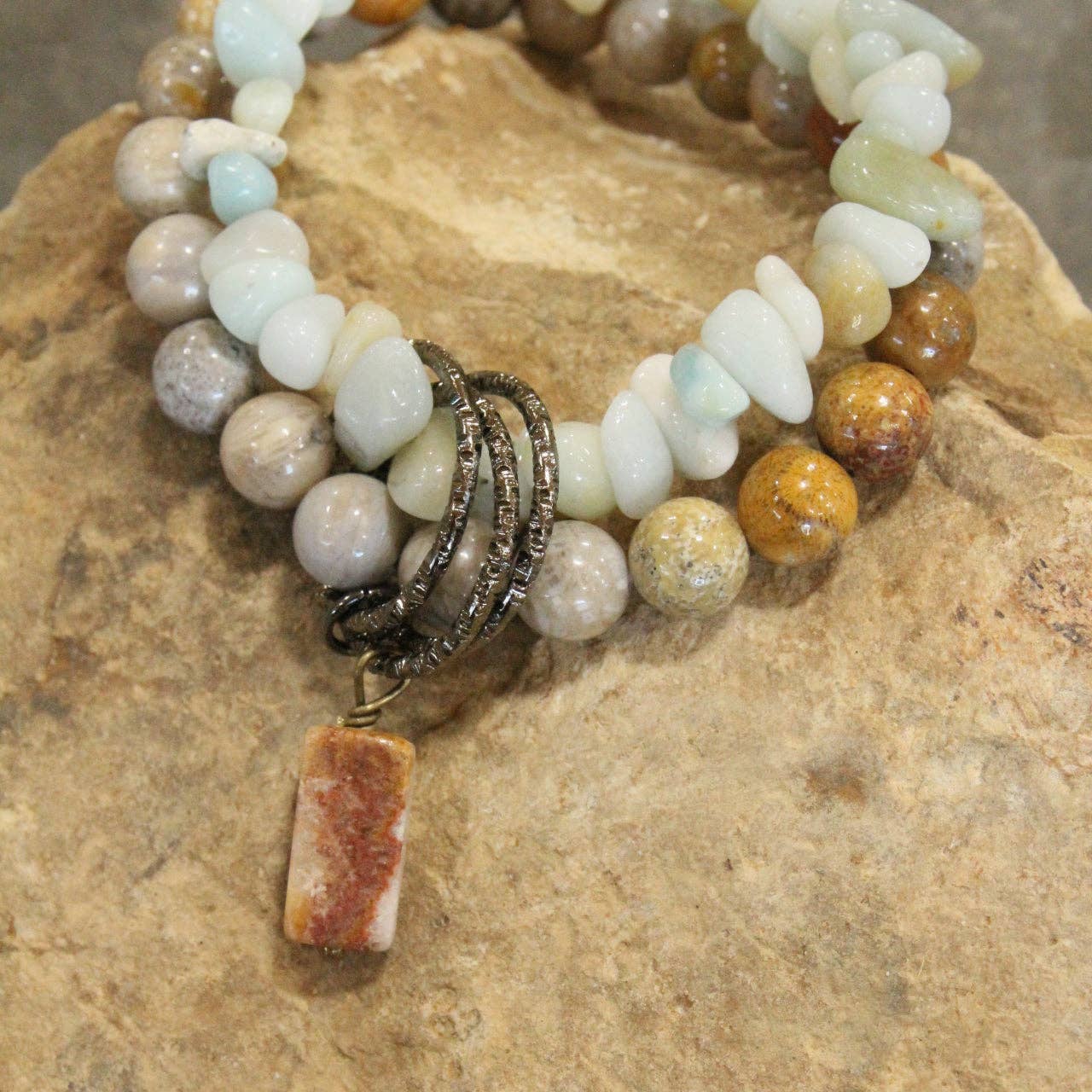 Our ONE-OF-A-KIND jewelry is handcrafted & created just for YOU. We carefully handpick our stones & findings to ensure that each Collection allows you to elevate your wardrobe & express your unique style; whether your reserved, bold, or daring we have something for you to show off your personality. Our designs are created with vintage Czech beads, textured Picasso beads, crystals, natural stones; which includes: amazonite, topaz, apatite, aventurine, quartz, fossil, jasper, jade, howlite, hematite, lapis lazuli, turquoise, magnesite, & more. To top off these designs, each piece will be touched with a mixture of nickel, gunmetal, bronze, silver, & copper, metals. Our pieces can definitely take your ordinary outfit to EXTRAordinary!
