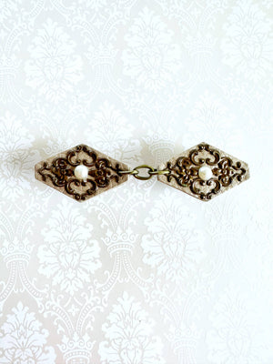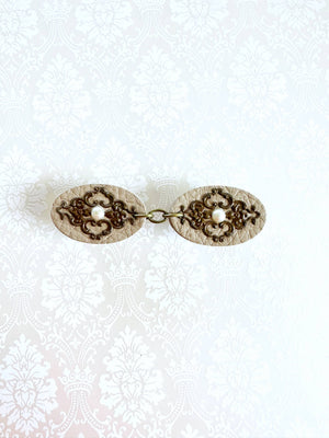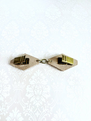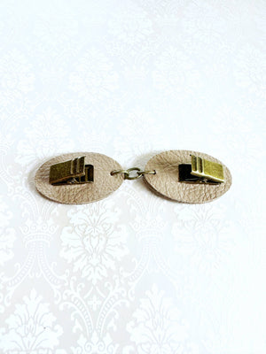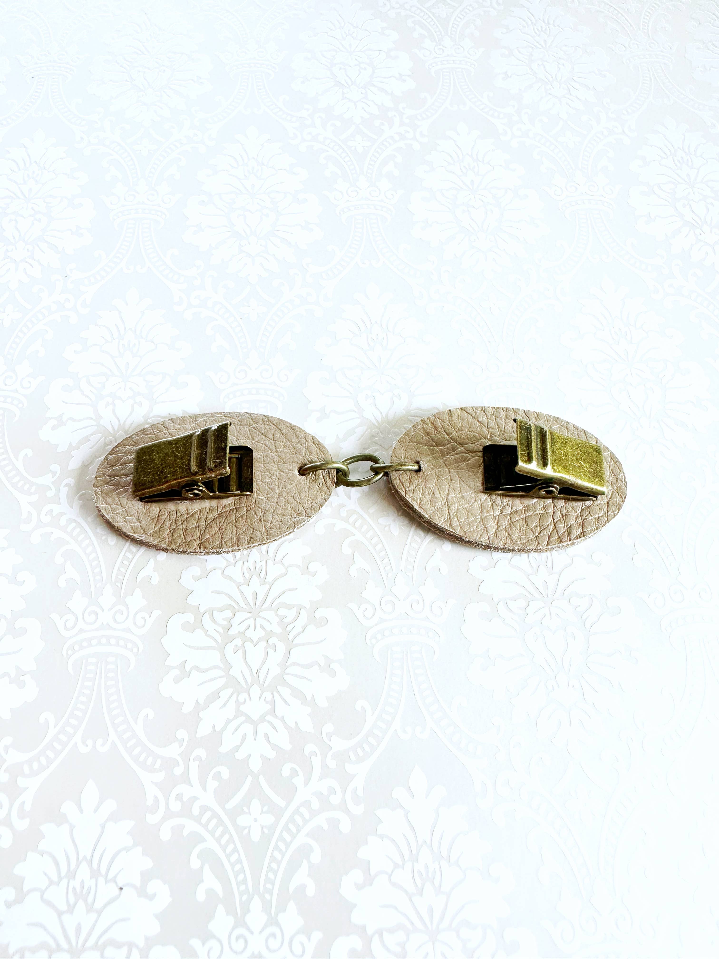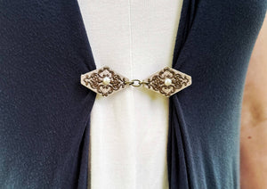 The Romantics Cltn – These timeless classics act as tiny, tasteful, modern mini-tailors! Double bronze ornate metal scroll on a base of champagne leather. A pretty, dainty Victorian look that adds an elegant touch to any outfit. Each Klip features our new & improved grip clips, with a wide mouth to hold thick fabrics securely & open easily. Now includes a pair of removable silicone sleeves to protect more delicate fabrics. 3.5” long x 1” wide Doubled Oval or Squared-off Diamond Mini-Tailor Magic: Ideal for cardigans, sweaters, dresses, shirts, and tunics, KardiKlips™ & Kardi-Pins® provide a pretty & discreet way to hide bulges and problem areas, allowing your customers to highlight the curves they're proud of and achieve a nipped-in appearance where they want it!