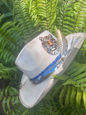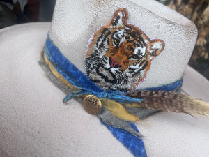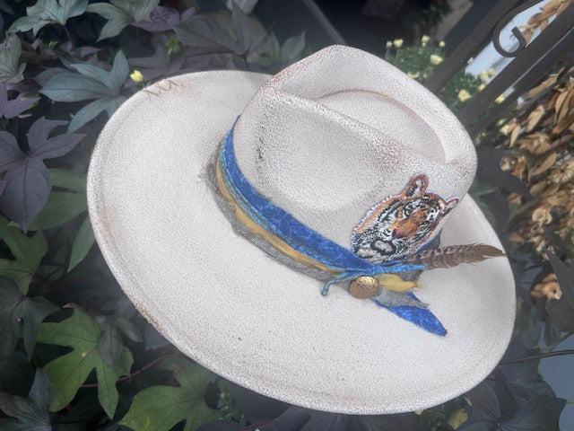 Hand painted and distressed with custom colors and personalized details specifically for you team's biggest fans! Provides your customers the most unique, one of a kind game day style!! Western, wire brim -elastic stretch sweatband - one size fits most Flat Brim, rancher hat - ribbon drawstring sweatband - one size fits most -Photos are examples that have been previously made. . All bands, buttons, overall distressed look may vary slightly, since these are all one-of-a-kind pieces & some vintage materials are used.