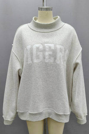 'TIGERS' Embroidered Mock Neck Sweatshirt - Mock-neck - Drop shoulder, long sleeves - Softest cozy fleece - Oversized fit - Rib banded hemline and cuffs is not reversible design. ** The pants made with the same fabric as this design, and that can be worn as a set