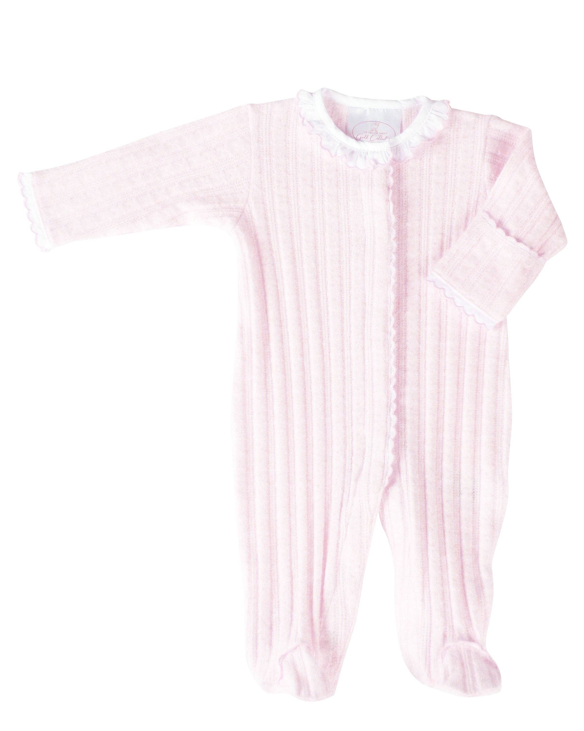 Introducing the Amory footed pajamas - the ultimate classic pajama for that new arrival. Designed to create cherished memories for generations to come. Made with premium 100% cotton knitted sweater fabric. A delicate ruffled collar paired with classic tailoring make this the ultimate luxury set. Full front snap opening. Comes in pink 3M