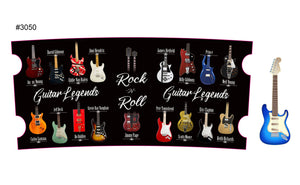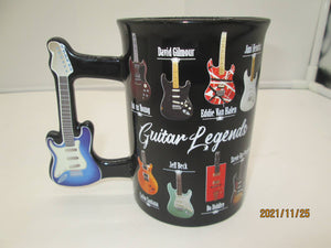 16 oz mug with guitar handle pictured with guitars, the caption "Rock -N- Roll Guitar Legends" and various names: Angus Young, David Gilmour, Jimi Hendrix, Eddie Van Halen, Carlos Santana, Jeff Beck, Bo Diddley, Steve Ray Vaughan, Jimmy Page, James Hetfield, Billy Gibbons, Prince, Neil Young, Pete Townsend, Scotty Moore, Eric Clapton, and Keith Richards.