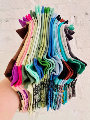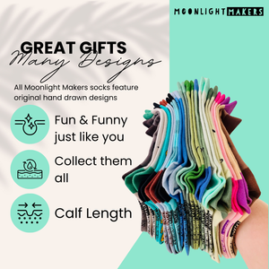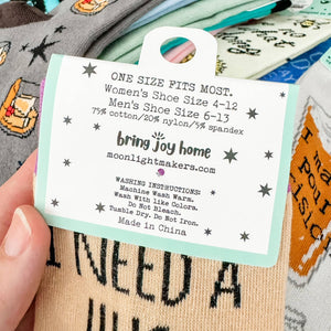 Step into comfort and style with our premium Knit Novelty Crew Socks, designed with love in NC! KEY FEATURES: - One Size Fits Most: Women's shoe size 4 to12, Men's shoe size 6 to13 - Vibrant Designs: fun and colorful patterns, printed on both sides, to brighten your day - Ultimate Comfort: Super soft with a Y Heel counter for that perfect fit - Premium Material: 75% cotton, 20% nylon, 5% spandex – because your feet deserve the best! - Calf-Length: Rock these socks with any outfit - Easy Care: Machine washable, so they’re always ready for the next adventure Stock up on these playful socks and help your customers Bring Joy Home. KEYWORDS: Perfect pairs, socks, sock style, sock life, sock lover, comfy, soft, warm, happy socks, gift for him, gift for her, stocking stuffer, fun, merch, accessories, novelty socks, crew socks, knit socks, funny socks, mother's day, cute socks, reading accessories, Christmas, funny sock gift, gift for bookwork, gift for reader, bookstore, novelty