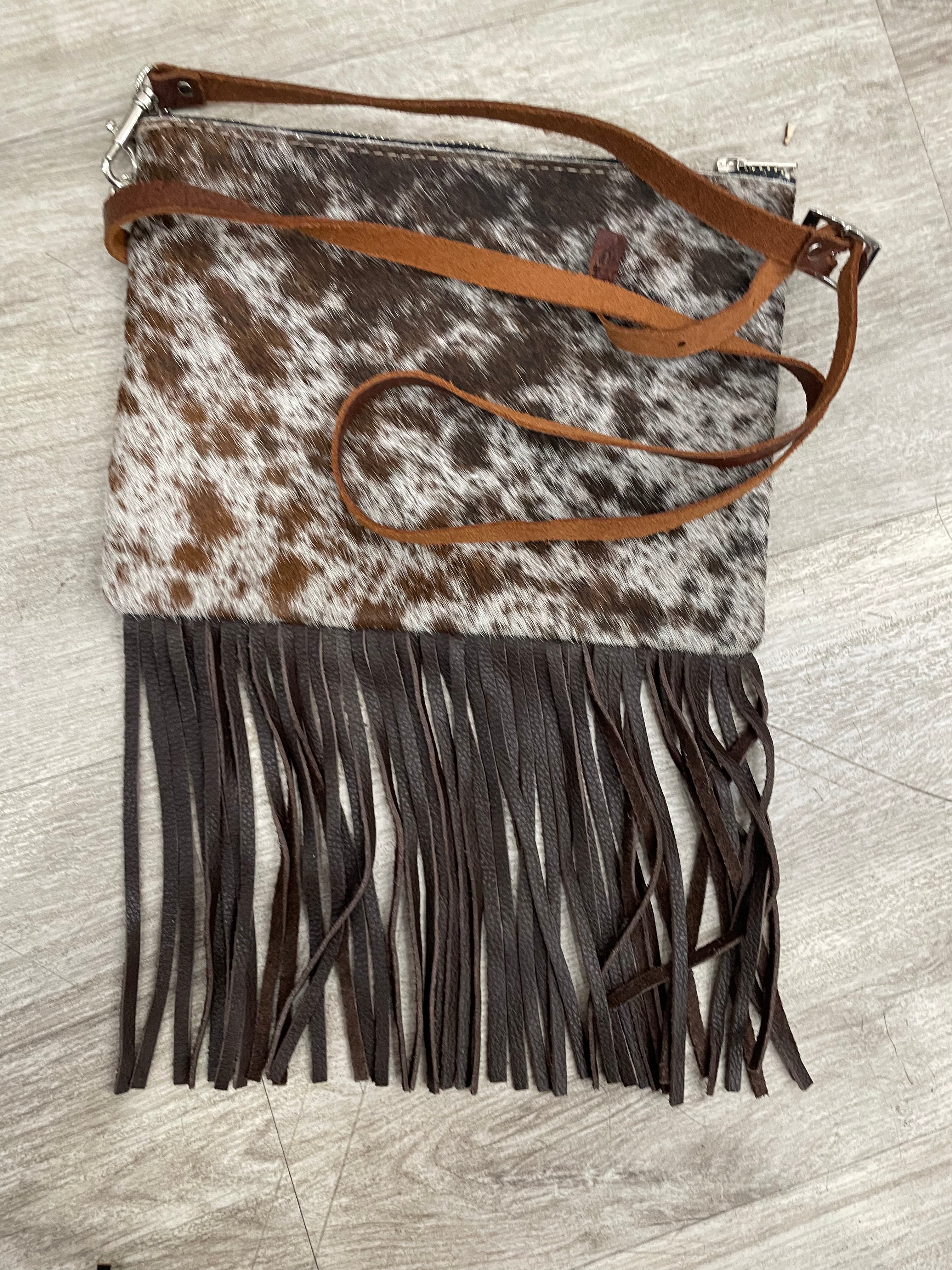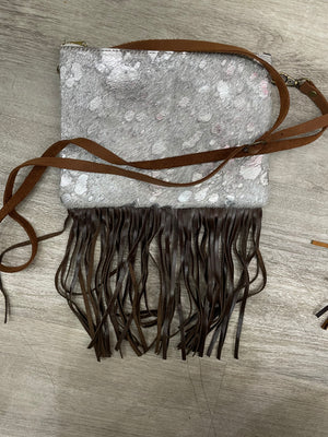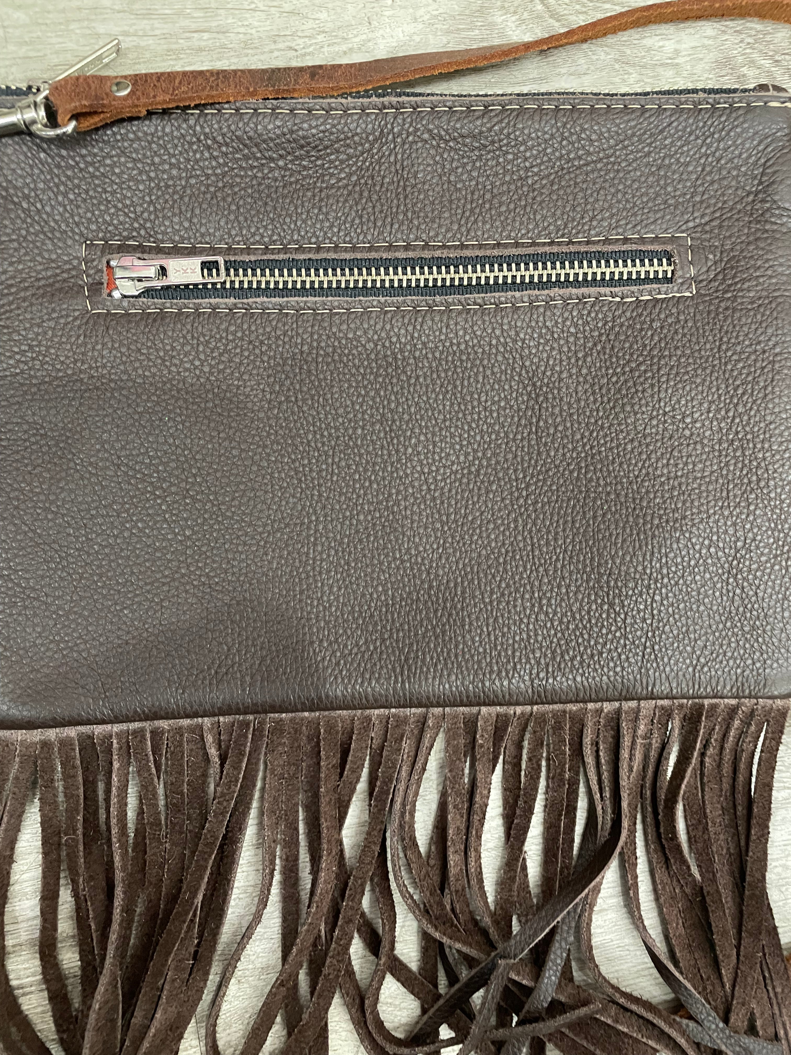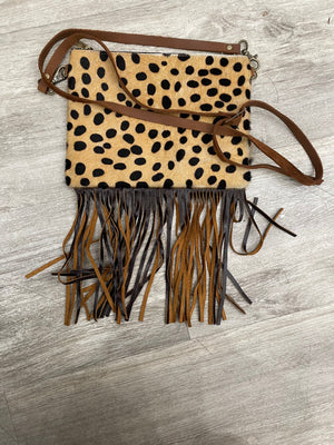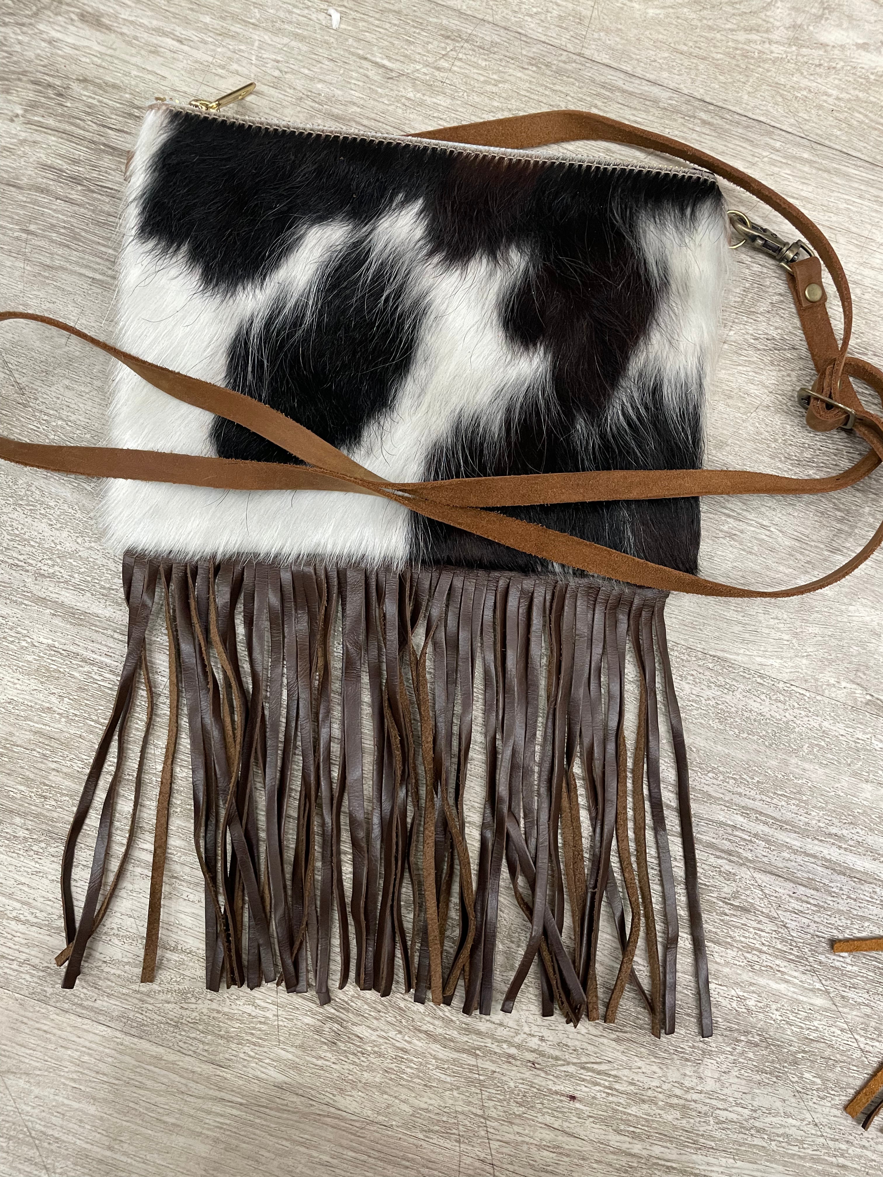 Unique leather fringe & faux fur purse with detachable leather strap and back zipper.