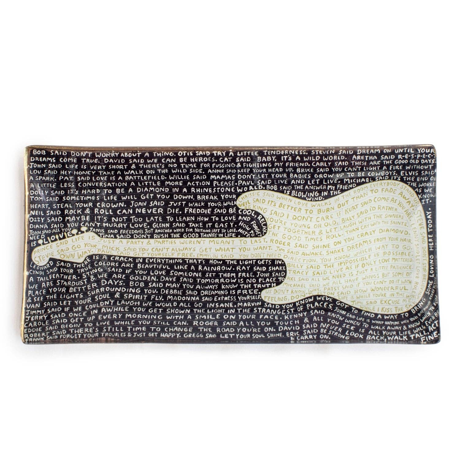 Add some color and fun to your home with these decorative plates inspired by some of our most popular art prints! Use them as a catchall, prop them up or use them to hold your jewelry. Details: * Size: 8.5" x 4" * For decorative purpose only. * Quotes include: "Bob said don’t worry about a thing. Otis said try a little tenderness. Steven said dream on until your dreams come true. David said we can be heroes. Cat said baby, it’s a wild world. Aretha said R-E-S-P-E-C-T. John said life is very short & there’s no time for fussing & fighting my friend.