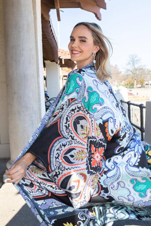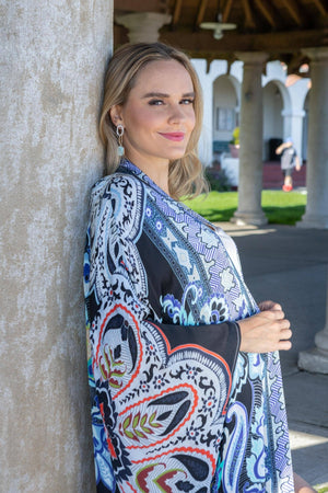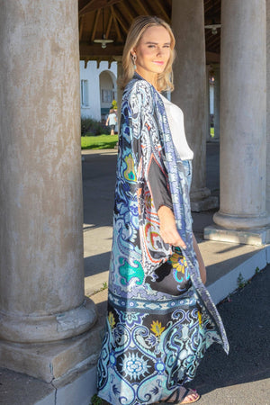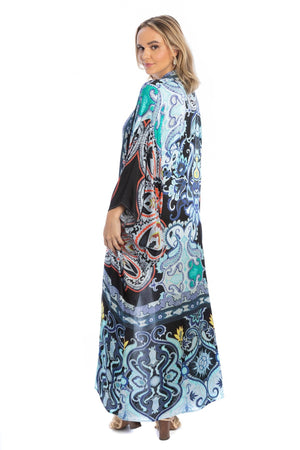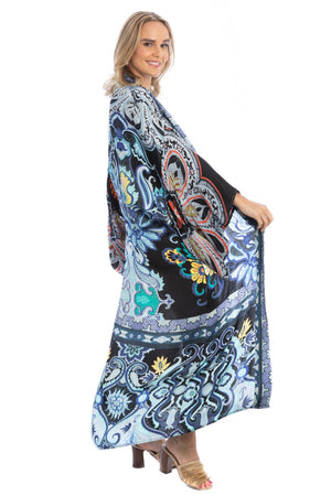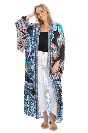 Looking for something elegant yet edgy for yourself? Saachi got you covered. Full-sleeved kimono with all-over tribal prints. It is made of viscose and has an open front and longline length, making it stylish, comfortable, and simple to wear. Pair it with your favorite pair of skinny jeans, and you'll be inundated with praises in no time! Material: 100% Viscose Size: 54" Length