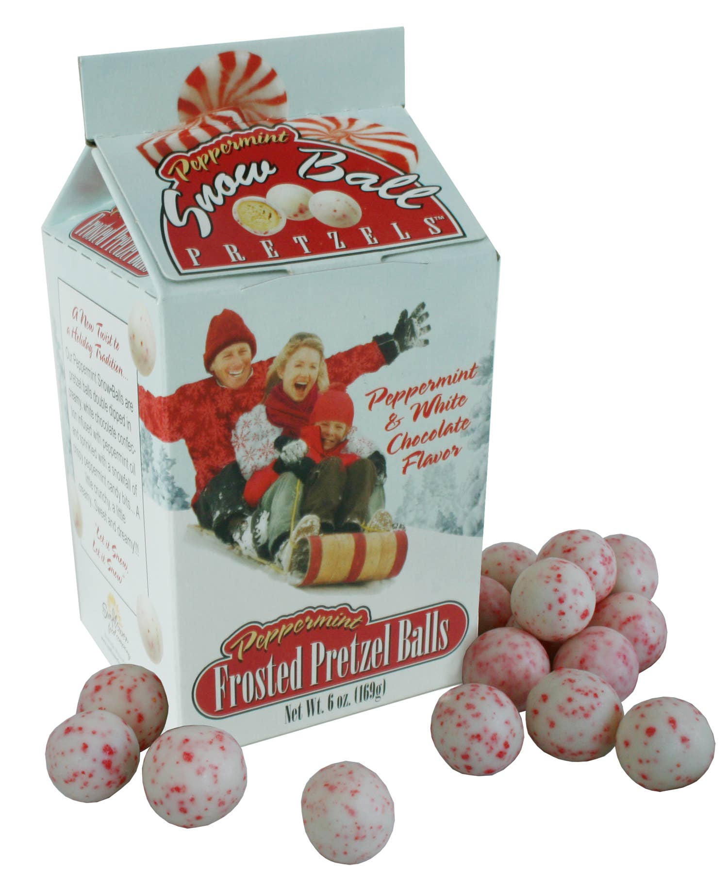 Pretzel bites dipped in creamy white chocolate with peppermint bits. Retro graphic carton.
