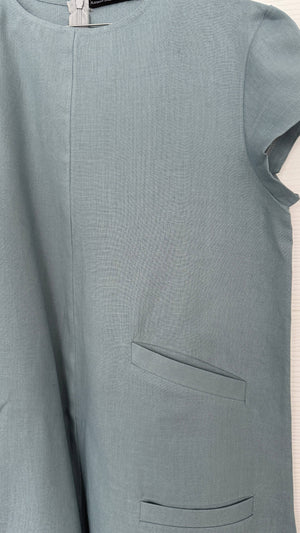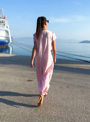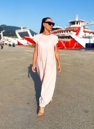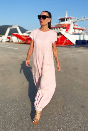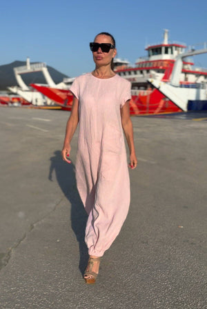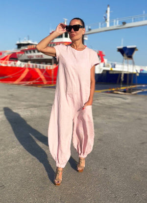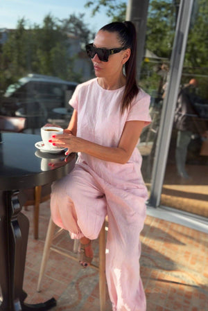 Product Title: Light Pink Linen Sleeveless Jumpsuit with Cap Sleeves and Wide Legs Product Description: * Material: 100% linen, soft and breathable for summer wear * Design: Modern fit with cap sleeves and wide legs * Features: * Elastic cuffs at the leg ends for a comfortable fit * Convenient side pockets for practicality * Zipper at the back for easy dressing * Color: Light pink * Size & Fit: Model is 1.70m/5'5" tall and wears a size M Perfect for a chic, comfortable summer look * Ideal for casual outings, holidays, or relaxed days
