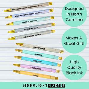 Inspire and uplift with the "You've Got This Pen Set" - a collection of 5 colorful pens featuring encouraging words like "Amazing," "Resilient," and "Courageous." These pens are perfect for anyone needing a boost of motivation. Ideal for gifts during challenging times, personal milestones, or just because, these pens are a thoughtful way to show support and encouragement. Offer your customers a stylish and meaningful gift option with this inspiring pen set. Stock up and spread positivity with every stroke! Details: - Each set includes 5 vibrant pens adorned with gold accents, perfect for adding a touch of flair to any workspace - Black Ink Pens -